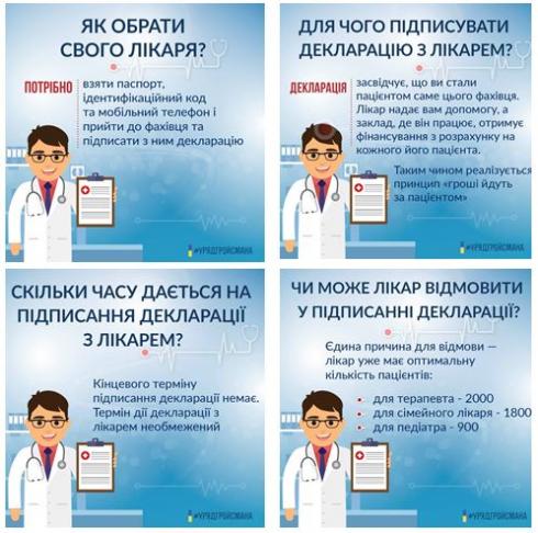 В рамках медичної реформи з 2 квітня в Україні стартувала кампанія з обрання лікаря. Люди вибирають лікарів, яким довіряють, та підписують з ними декларації на обслуговування. З липня медичні заклади почнуть переходити на нову систему фінансування – держава платитиме саме тим лікарям та медзакладам, до яких звертаються люди за допомогою.