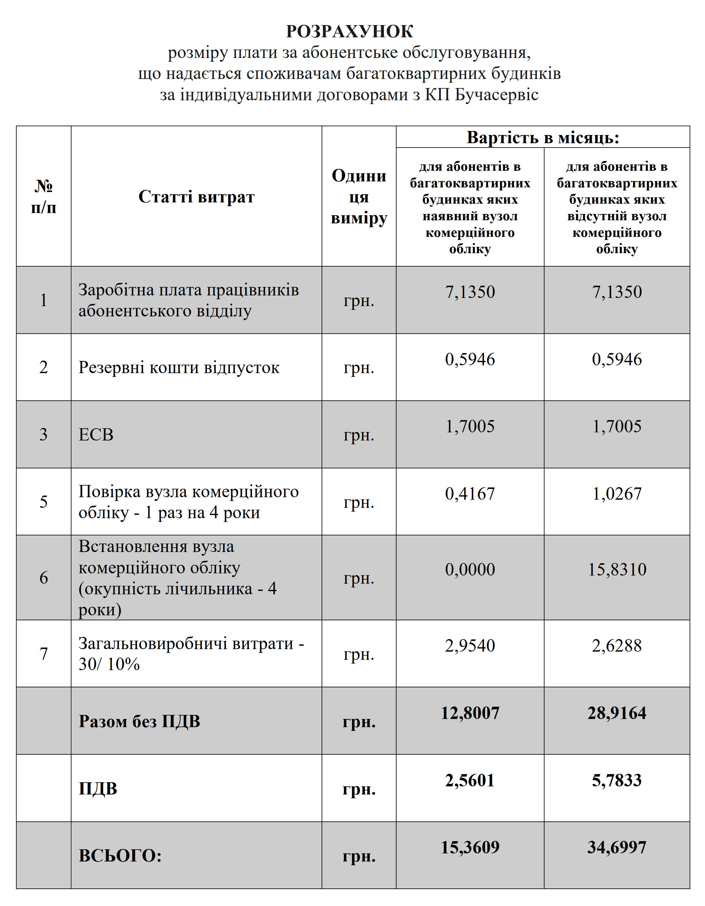 Вся інформація є на сайті Бучанської міської ради за посиланням: https://bucha-rada.gov.ua/sites/default/files/abonplata_1.pdf. Також дублюємо розрахунок далі: