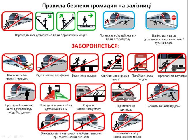 Основними причинами травмування громадян на залізниці залишається порушення ними правил безпеки на залізничному транспорті. Це, зокрема, перехід залізничних колій перед потягом, що наближається; ходіння безпосередньо по коліях або близько до них (на відстані менше п’яти метрів до крайньої рейки); знаходження надто близько від краю пасажирської платформи (менше, ніж півметра) під час проходження поїзда, ігнорування заборонних звукових та світлових сигналів залізничних переїздів.