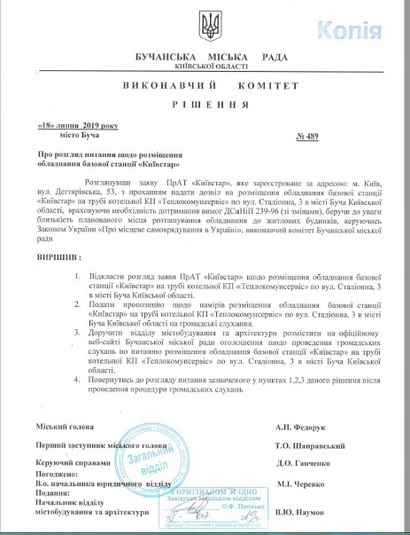 На засіданні виконавчого комітету Бучанської міської ради, що відбулось 18.07.2019 було прийняте відповідне рішення за № 489 від «Про розгляд питання щодо розміщення обладнання базової станції «Київстар».
