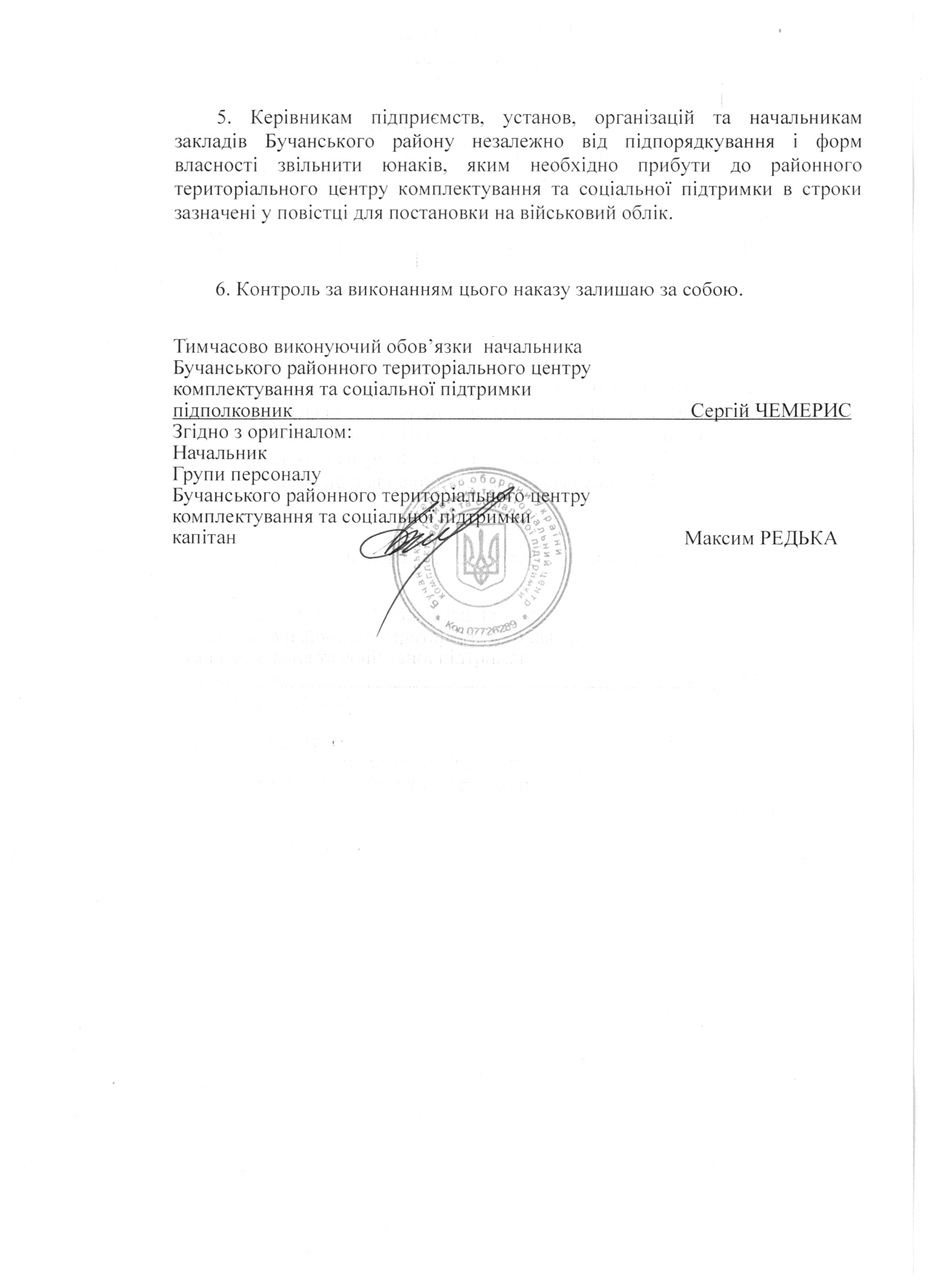 5. Керівникам підприємств, установ, організацій та начальникам закладів Бучанського району незалежно від підпорядкування і форм власності звільнити юнаків, яким необхідно прибути до районного територіального центру комплектування та соціальної підтримки в строки зазначені у повістці для постановки на військовий облік.