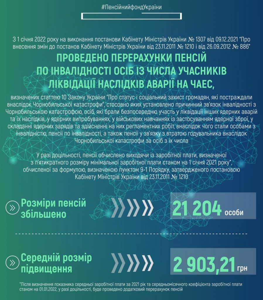 Крім того, на виконання постанови Кабінету Міністрів України № 1307 від 09.12.2021 “Про внесення змін до постанов Кабінету Міністрів України від 23.11.2011 № 1210 і від 26.09.2012 № 886” з 01 січня 2022 року проведено перерахунки пенсій по інвалідності осіб із числа учасників ліквідації наслідків аварії на Чорнобильській АЕС, визначених статтею 10 Закону України “Про статус і соціальний захист громадян, які постраждали внаслідок Чорнобильської катастрофи”, стосовно яких установлено причинний зв’язок інвалідності з Чорнобильською катастрофою, осіб, які брали безпосередню участь у ліквідації інших ядерних аварій та їх наслідків, у ядерних випробуваннях, у військових навчаннях із застосуванням ядерної зброї, у складанні ядерних зарядів та здійсненні на них регламентних робіт, внаслідок чого стали особами з інвалідністю, пенсії по інвалідності, а також пенсії у зв’язку з втратою годувальника внаслідок Чорнобильської катастрофи за осіб з їх числа.