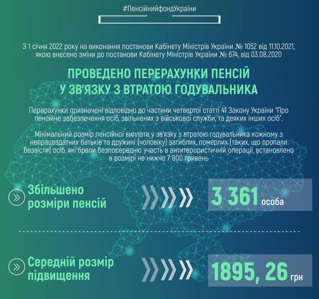 На виконання постанови Кабінету Міністрів України № 1052 від 11.10.2021, якоювнесені зміни до постанови Кабінету Міністрів України № 674 від 03.08.2020, з 01 січня 2022 року проведено перерахунки пенсій у зв’язку з втратою годувальника, призначених відповідно до частини четвертої статті 41 Закону України “Про пенсійне забезпечення осіб, звільнених з військової служби, та деяких інших осіб”.