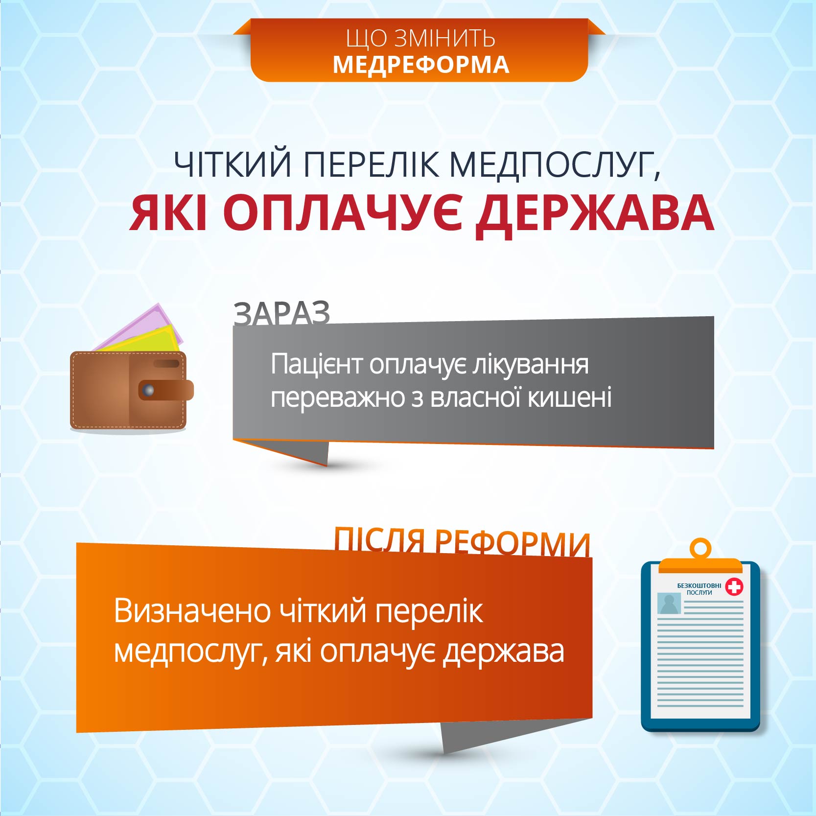 «Гроші йдуть за пацієнтом». Медична реформа передбачає зміну фінансування системи охорони здоров’я. Бюджетні кошти будуть спрямовуватись не на фінансування медичних закладів згідно кошторису, як зараз, а на оплату надання медичної послуги конкретній людині. «Гроші йтимуть за пацієнтом» – в поліклініку, в лікарню, до сімейного лікаря, куди прийшла людина за медичною допомогою. Незалежно від місця знаходження і форми власності медзакладу. Пацієнт самостійно вибиратиме лікаря чи медзаклад, до якого звернутись, держава – оплачуватиме його лікування.