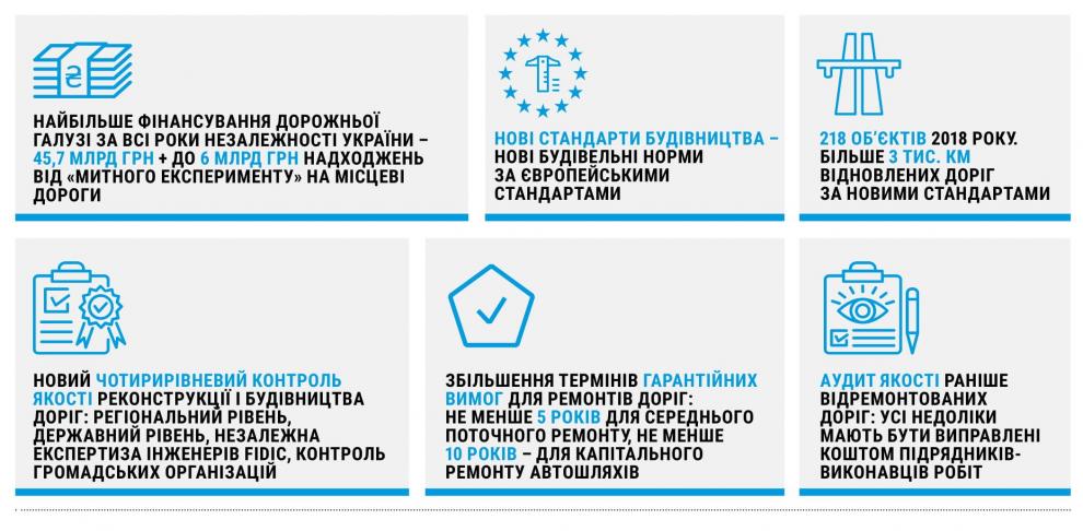 Ще минулого року Уряд розпочав масштабну реконструкцію українських доріг. Протягом 2017 року було відновлено більше 2 тис. км автошляхів. Цього року Уряд виділяє рекордні 45,7 млрд грн на ремонт і будівництво доріг за принципово новими стандартами якості. Також очікуються додаткові надходження – до 6 млрд грн – від “Митного експерименту” на місцеві дороги. Загалом програма до 2033 року передбачає обсяг фінансування близько 298 млрд грн за рахунок різних джерел фінансування.