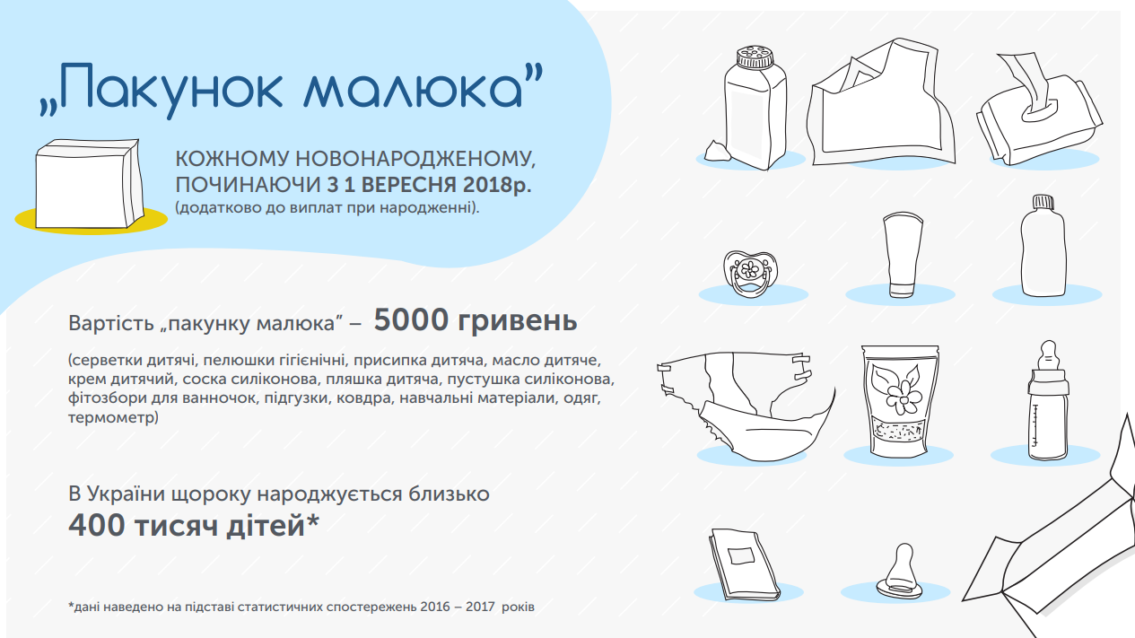 З 1 вересня 2018 року батьки новонароджених отримають додаткову допомогу від держави – «пакунок малюка». Кожна мама отримає в пологовому будинку для своєї дитини пакунок з найнеобхіднішими для малюка речами – це одяг, підгузки, ковдри, дитяча олійка та крем, присипка, пляшечка, соска, пустушка, серветки, пелюшки, термометр, а також навчальні матеріали щодо догляду за дитиною. Кожна дитина, з 400 тисяч, які щороку народжуються в Україні, отримає від держави речі, які потрібні в перші дні життя.