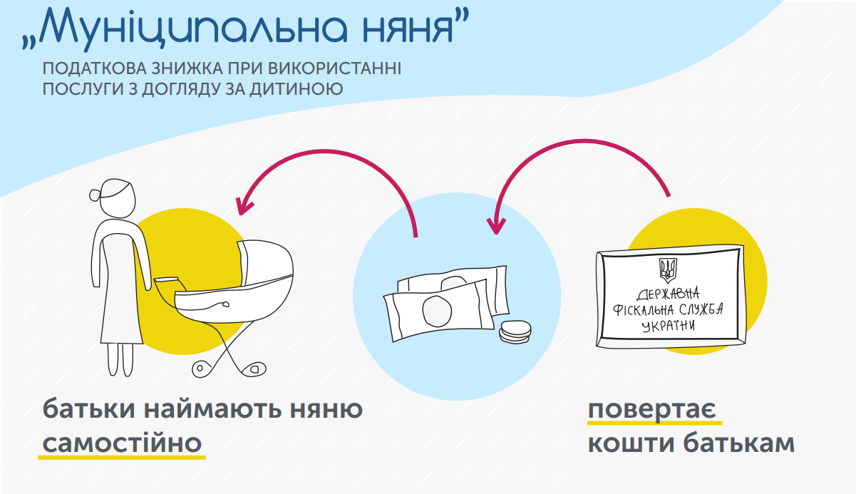 З 1 січня 2019 року запроваджується проект «Муніципальна няня», який дозволить батькам зменшити витрати на послуги няні для дитини. Держава відшкодовуватиме батькам послуги няні, що доглядає за дитиною до 3-х років, через надання податкової знижки. Розмір відшкодування – один прожитковий мінімум для дітей віком до 6 років (станом на 1.01.2018 це 1492 грн.) – за кожний місяць роботи няні. Батьки заключають офіційний договір з нянею, а держава повертатиме батькам гроші за її послуги.