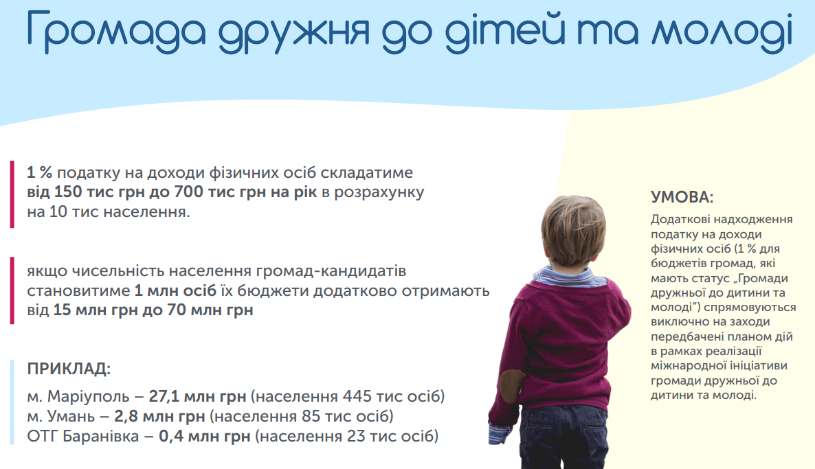 Уряд стимулює отримання громадами статусу ЮНІСЕФ «Громада дружня до дітей та молоді». Громади, міста, що матимуть такий статус, зможуть розраховувати на додаткові надходження до своїх бюджетів, які можна спрямувати на розвиток дитячої інфраструктури, створення комфортних умов для розвитку та навчання дітей. З наступного року громади, дружні до дітей, отримають до своїх бюджетів додаткові надходження податку на доходи фізичних осіб (ПДФО) в розмірі 1% - це 150-700 тисяч грн. на рік в розрахунку на 10 тисяч населення. Великі громади, населення яких складає 1 мільйон осіб, отримають додатково до бюджетів від 15 до 70 млн.грн.