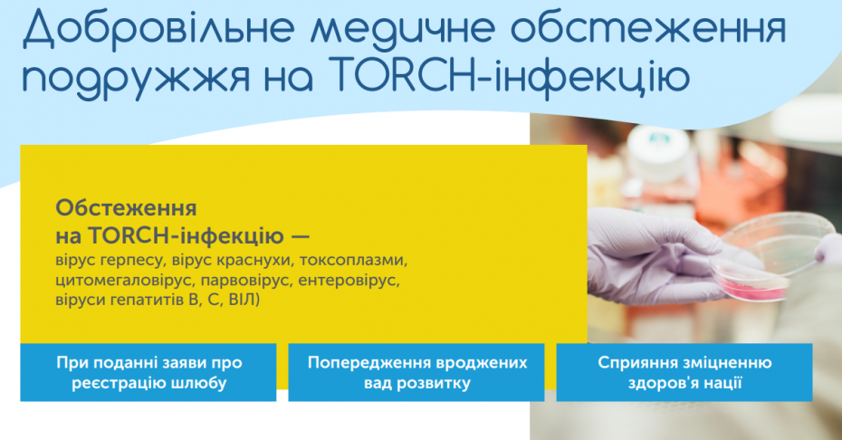 З 1 січня 2019 року кожна майбутня родина отримає можливість пройти безоплатне медичне обстеження, щоб убезпечити народження дітей з вродженими вадами. За даними Держстату, щороку в Україні 10% дітей народжуються з вадами, що призводять до інвалідизації та смерті. Медичне обстеження майбутніх батьків допоможе зменшити цей сумний показник. Особи, які подали заяву про реєстрацію шлюбу, матимуть право пройти безоплатне медичне обстеження на TORCH-інфекцію (вірус герпесу, вірус краснухи, токсоплазми, цитомегаловірус, парвовірус, ентеровірус, віруси гепатитів В, С, ВІЛ).