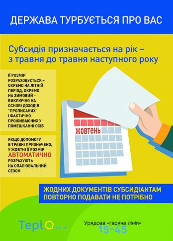В Україні офіційно розпочався процес розрахунку розміру зимової субсидії. У жовтні управління соціального захисту населення автоматично розрахують розмір допомоги на опалювальний сезон усім тих, кому у травні цього року субсидію було перепризначено на новий період - 2017-2018рр. Жодних документів чи довідок субсидіантам повторно не потрібно подавати чи доносити. Програма житлових субсидій максимально спрощена для людей.