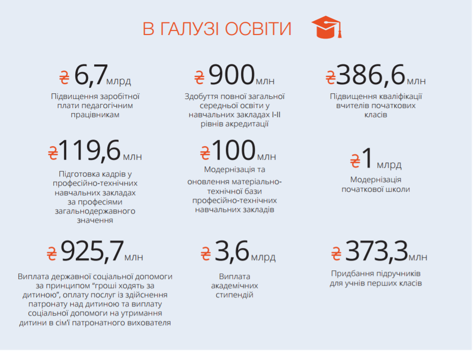 У наступному році освіта залишиться одним із пріоритетів соціальних видатків. Тому у 2018 р видатки зведеного бюджету на освіту збільшаться майже на 20% і складуть 219,1 млрд. грн.