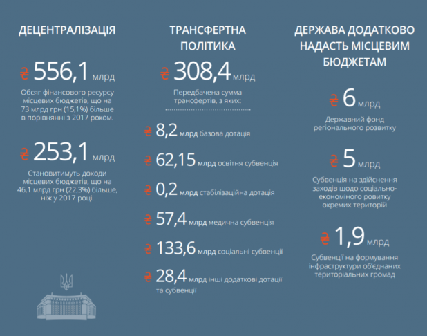 Уряд продовжує процес децентралізації, який сприяє фінансовому зміцненню територіальних громад. В наступному році ресурс місцевих бюджетів складе 556,1 млрд. грн., що на 15,1% більше, ніж цього року. Доходи місцевих бюджетів збільшаться на 22,3% до 253,1 млрд грн.