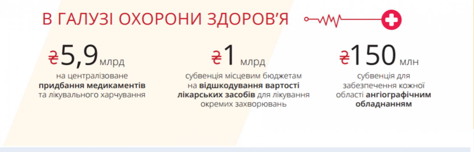 Продовжиться робота з розширення мережі центрів серцево-судинної хірургії. На це в бюджеті на наступний рік передбачено 150 млн.грн. Завдяки цьому люди, у яких стався інсульт або інфаркт, зможуть отримати своєчасну якісну медичну допомогу, зменшиться рівень смертності і інвалідності від серцево-судинних захворювань.