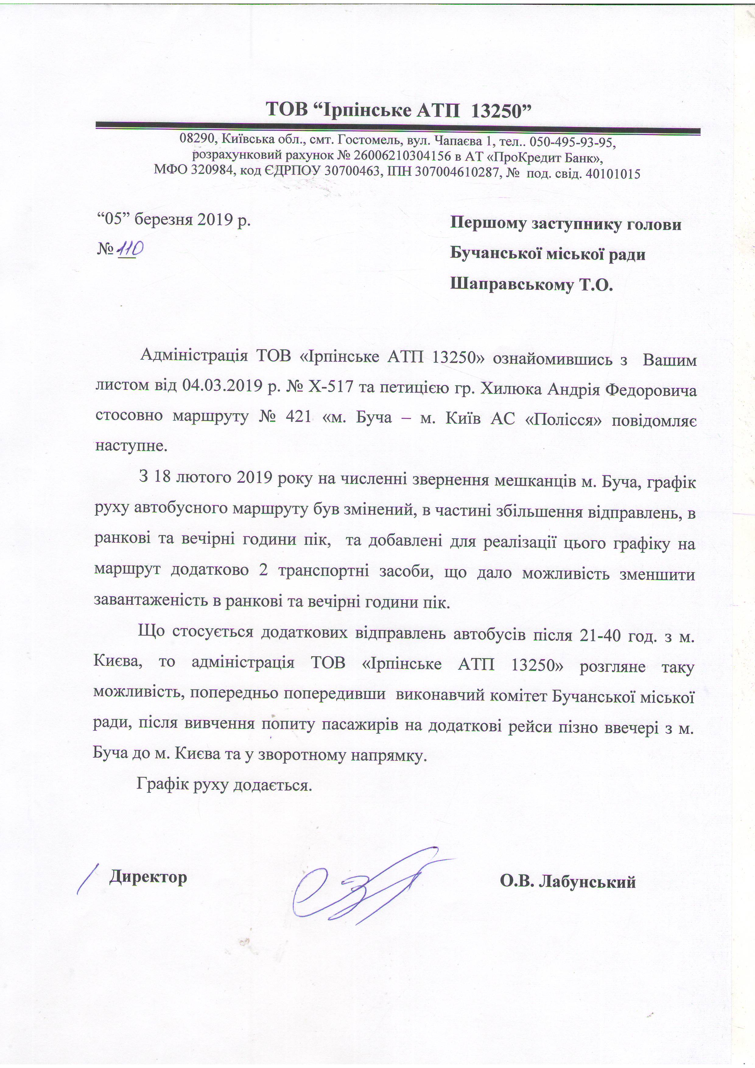Петиція "421 марштур Буча - м. Героїв Дніпра", яка набрала необхідну кількість голосів, розглянута. Відповідь у прикріпленому файлі.