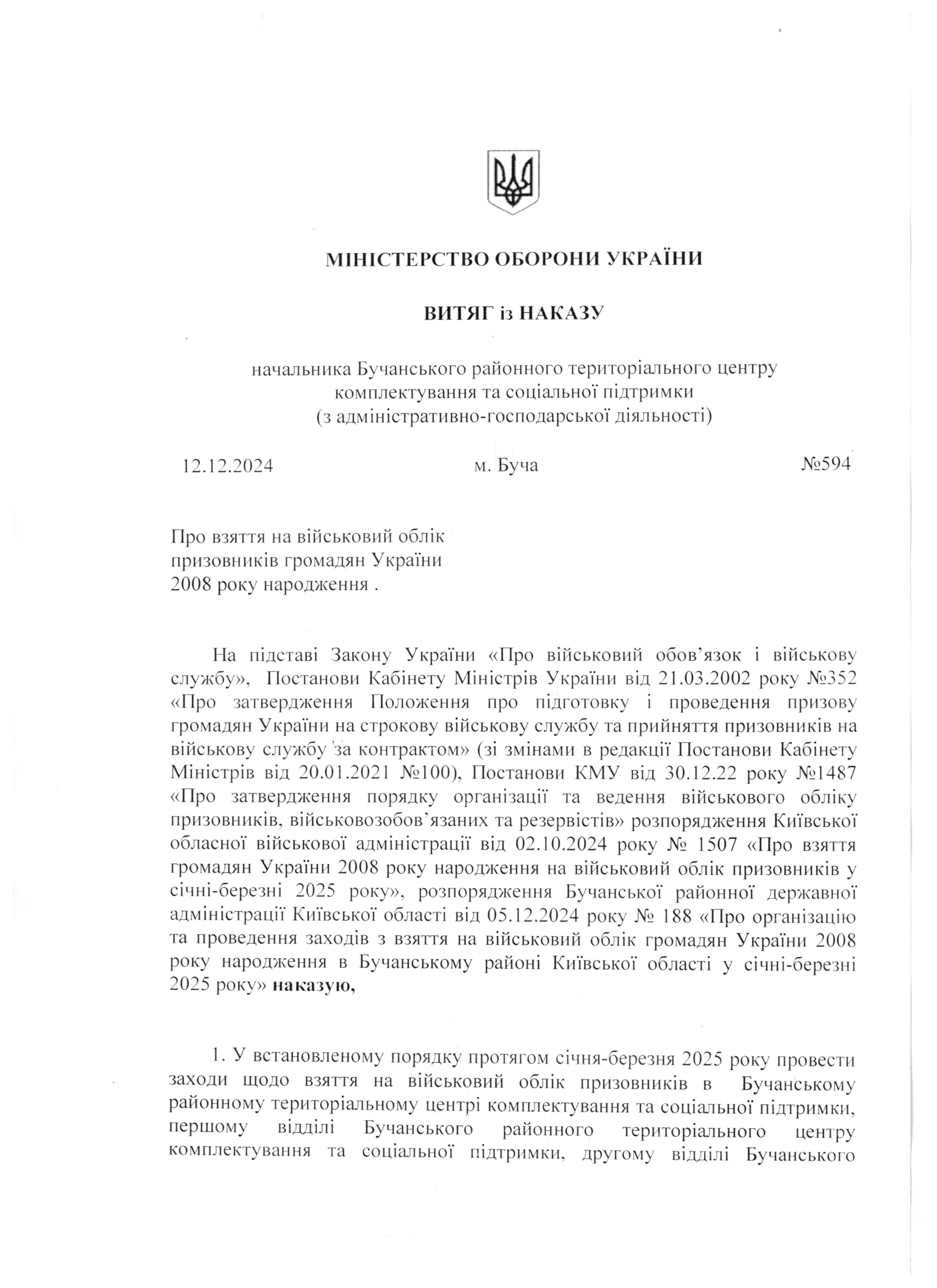 На підставі Закону України «Про військовий обовʼязок і військову службу», Постанови Кабінету Міністрів України від 21.03.2002 року Nº352 «Про затвердження Положення про підготовку і проведення призову громадян України на строкову військову службу та прийняття призовників на військову службу за контрактом» (зі змінами в редакції Постанови Кабінету Міністрів від 20.01.2021 Nº100), Постанови КМУ від 30.12.22 року Nº1487 «Про затвердження порядку організації та ведення військового обліку призовників, військовозобовʼязаних та резервістів» розпорядження Київської обласної військової адміністрації від 02.10.2024 року Nº 1507 «Про взяття громадян України 2008 року народження на військовий облік призовників у січні-березні 2025 року», розпорядження Бучанської районної державної адміністрації Київської області від 05.12.2024 року Nº 188 «Про організацію та проведення заходів з взяття на військовий облік громадян України 2008 року народження в Бучанському районі Київської області у січні-березні 2025 року» наказую,