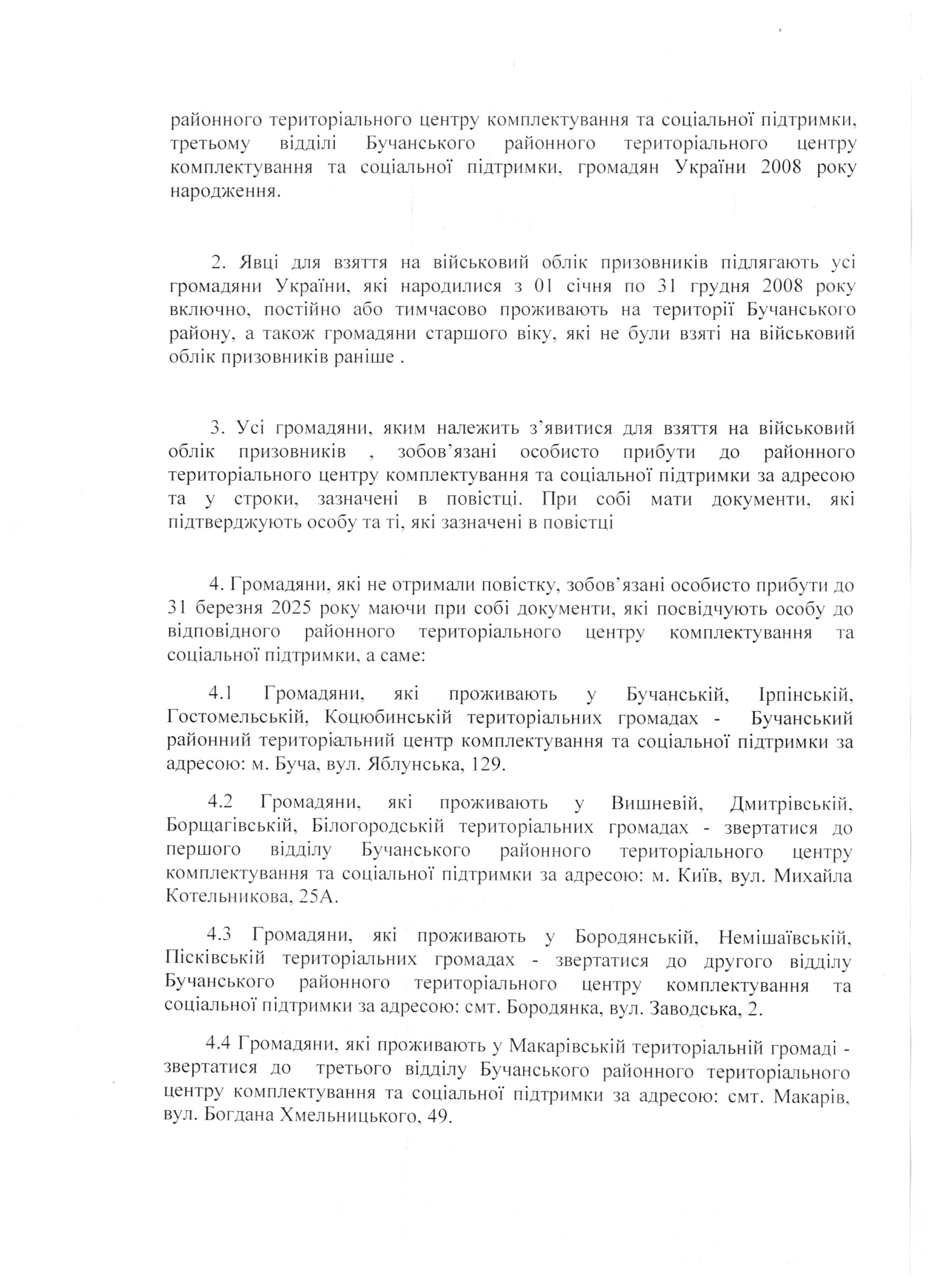4.1 Громадяни, які проживають у Бучанській, Ірпінській, Гостомельській, Коцюбинській територіальних громадах - Бучанський районний територіальний центр комплектування та соціальної підтримки за адресою: м. Буча, вул. Яблунська, 129.