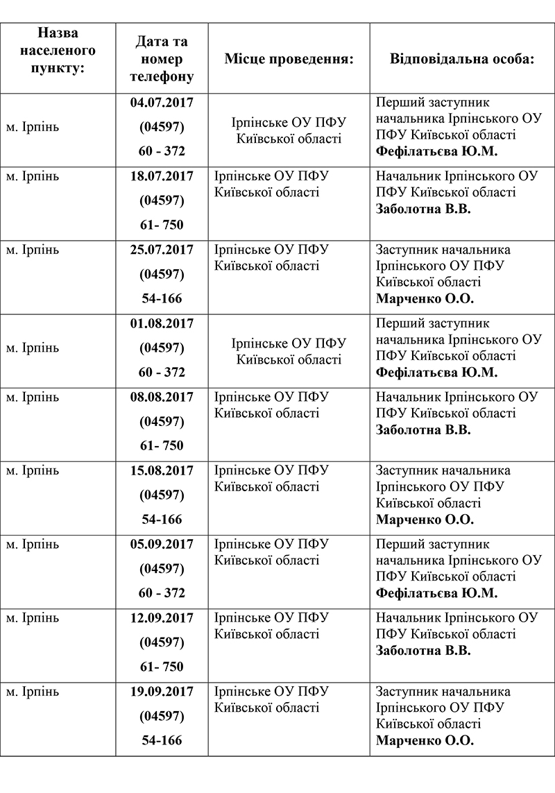 Головна > Управління Пенсійного фонду України в м. Буча > Графік гарячих телефонних ліній Ірпінського об’єднаного управління Пенсійного фонду України Київської області в Ірпінському регіоні на IІІ квартал 2017 року