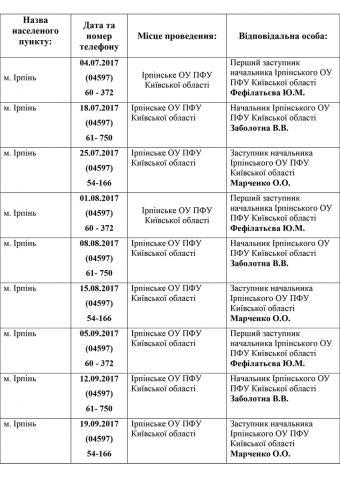 Графік гарячих телефонних ліній Ірпінського об’єднаного управління Пенсійного фонду України Київської області в Ірпінському регіоні на IІІ квартал 2017 року