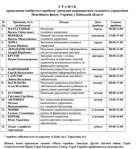 ГРАФІК проведення особистого прийому громадян керівництвом головного управління Пенсійного фонду України у Київській області