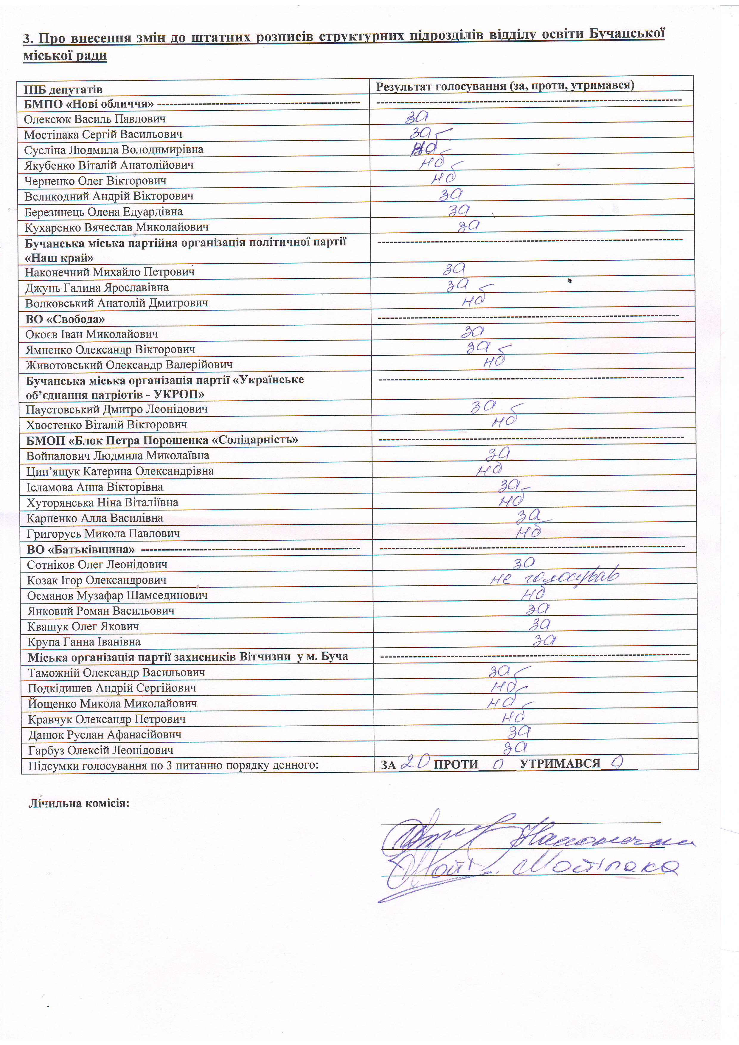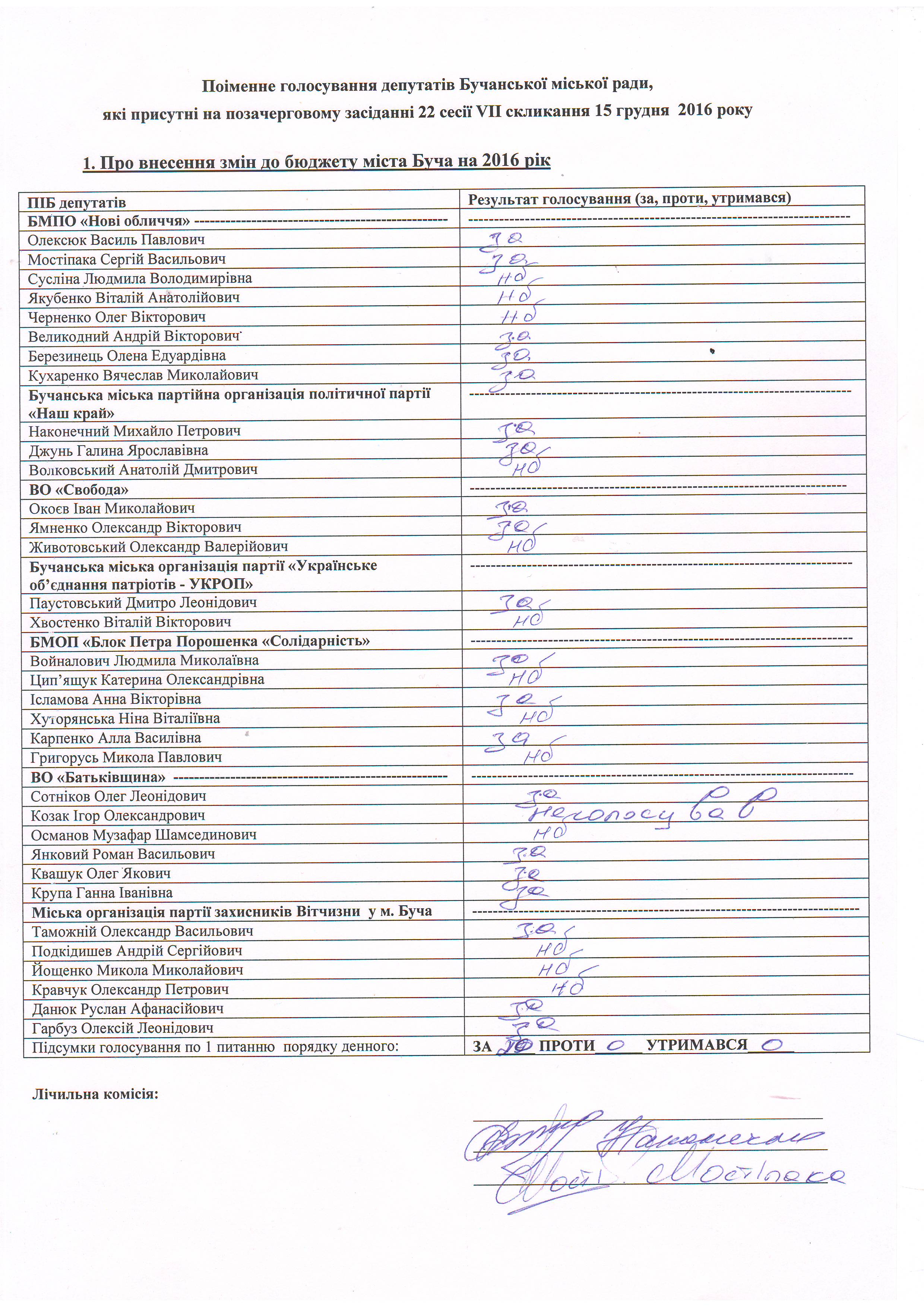 Підсумки поіменного голосування депутатів Бучанської міської ради 22 (позачергова) сесія VII скликання від 15.12.2016 р.